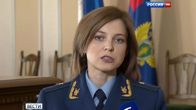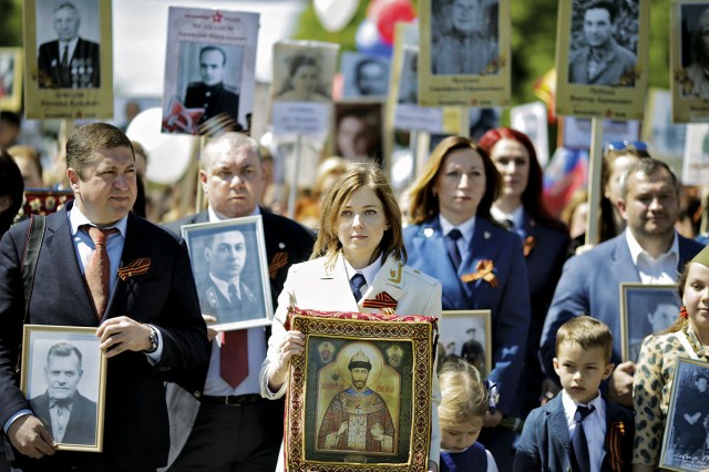 Crimea’s Chief Prosecutor Natalia Poklonskaya (C) carries an icon with a portrait of the last Russian tsar Nicholas II as she takes part in the Immortal Regiment march during the Victory Day celebrations in Simferopol, Crimea, on May 9, 2016.