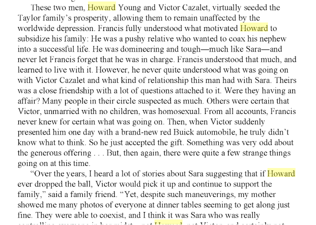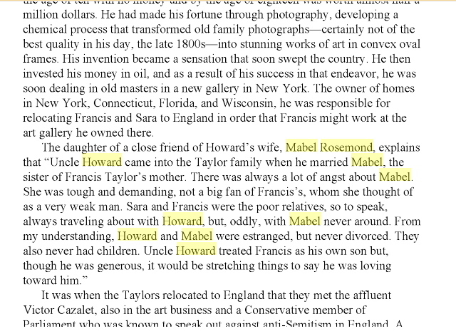 On 9 Dec 1930, sailing from Southampton and arriving in New York City, I find: “Francis Taylor, Sara, and Howard” all then living at “2 East 70th Street, New York City”. On 19 Jul 1934 sailing from Southampton, arriving in New York City, I find: “Francis Taylor, Sarah, Howard and Elizabeth” all then living at “677 5th Avenue, New York City”. We get the proof that Howard and Elizabeth were both born in London on 20 Nov 1936, sailing from Southampton, arriving in New York City : “Francis Taylor, Sarah, Howard born 27 Jun 1929 London, and Elizabeth born 27 Feb 1932 London” then living at “2 E 70th Street, New York City”.