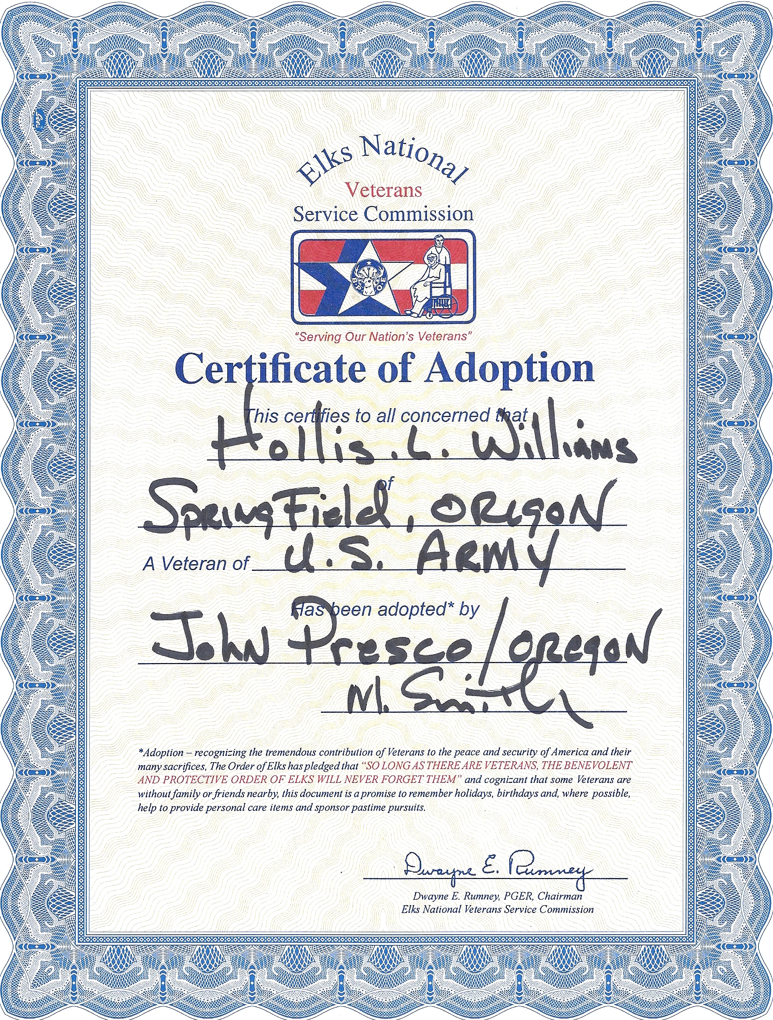It’s official! Hollis Lee Williams is my adopted Veteran Son! Hurrah!