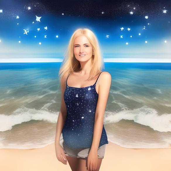 My mind made a image of Christine standing in front of the magical seascape I was working on in my studio located next to The Loading Zone’s sound-room. She came in to watch me paint. She wanted me to notice her. This morning I put Christine Wandel in front of that painting. I gave the Fotor AI this suggesting….A blonde woman on a magical beach with stars. The bottom one really looks like Christine!