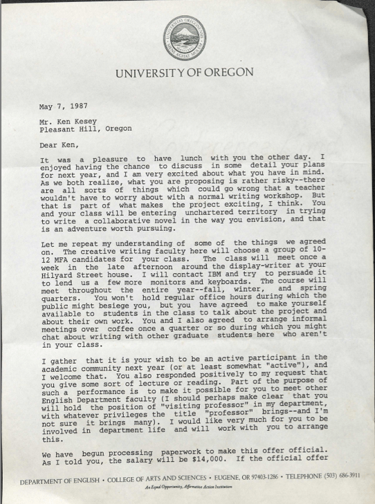 During the academic year of 1987-1988, Ken Kesey taught a graduate-level creative writing class of thirteen students at the University of Oregon. He charged the group with producing a full-length novel in one school year, which they did, publishing Caverns under the name O.U. Levon (Novel University of Oregon backwards) in 1990.