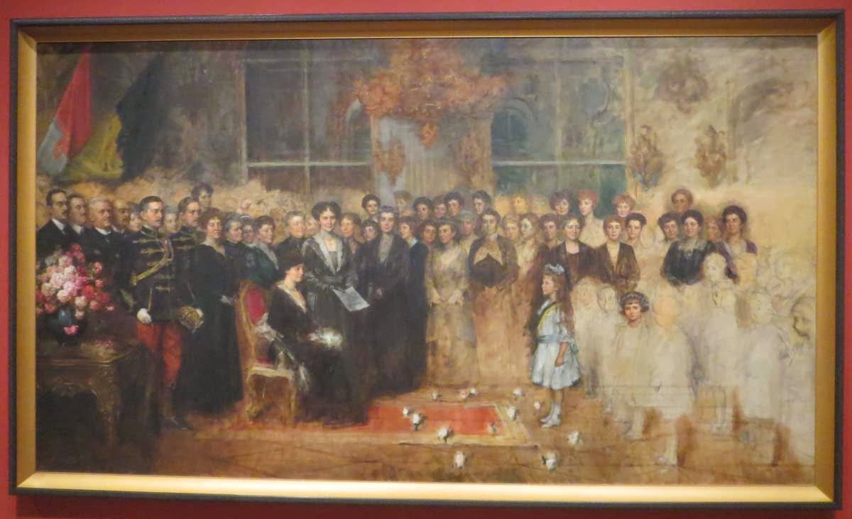 The artist began the work in October of 1918 at Schönbrunn Palace, where the young Empress Zita (1892 – 1989) received an audience of war orphans and a group of wealthy noblewomen, the Organization of War Godmothers, who had “adopted” them. Within hours, Empress Zita (shown seated on her throne), her husband, and their own eight children were forced to flee across the Swiss border because of the contentious political climate. Despite several attempts, they were never able to reestablish themselves on their thrones; both the Emperor and Empress died in exile.