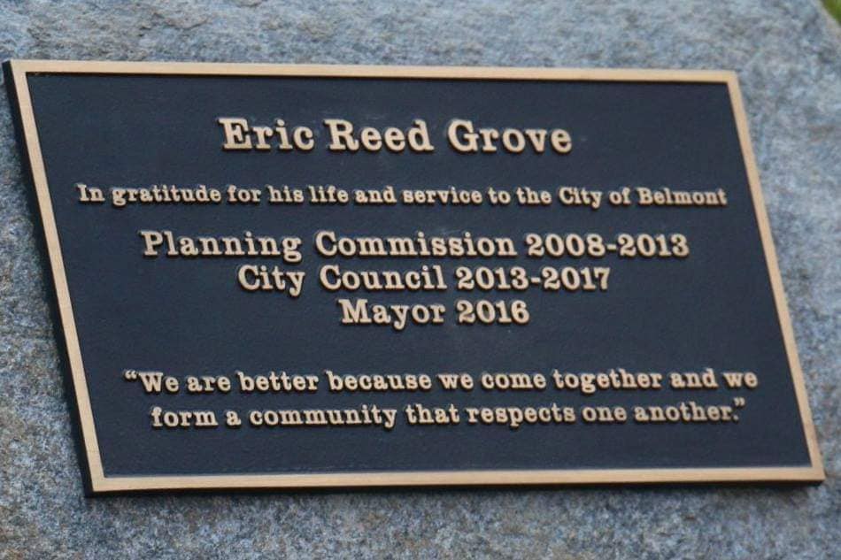 According to Belmont Parks and Recreation Director Brigitte Shearer, who was in attendance at the dedication, the parks department added new mulch to the grove and planted new vegetation, including five trees and several orange flowers — Eric’s favorite color. Parks staff also chose the stone for the memorial plaque and upgraded the grove’s irrigation system.