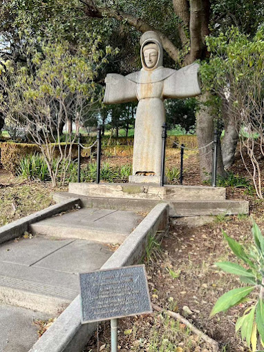 On July 15, 2024 I believe I found what members of the Belmont Historical Society, did not want me to see. Above is a statue of Saint Francis with outstretched arms, which is a WELCOME sign. In the background is Ralston Hall where William Stuttmeister got married to Augustus Janke, the daughter of Carl Janke. I see them climbing the stairs to Their Dream! The future – is theirs! I stare at the broken cement caused by believers kneeling……and praying. There is a plaque. Inside this mansion is one of the homes that Carl brought around the Cape.