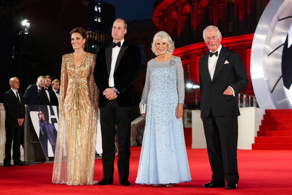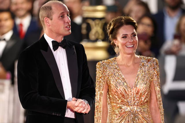 William and Kate arrived first to the premiere and were driven down the red carpet in a fleet of Range Rovers past one of the famous Aston Martin cars from the film, all while being waved on by a packed crowd outside the historic venue.