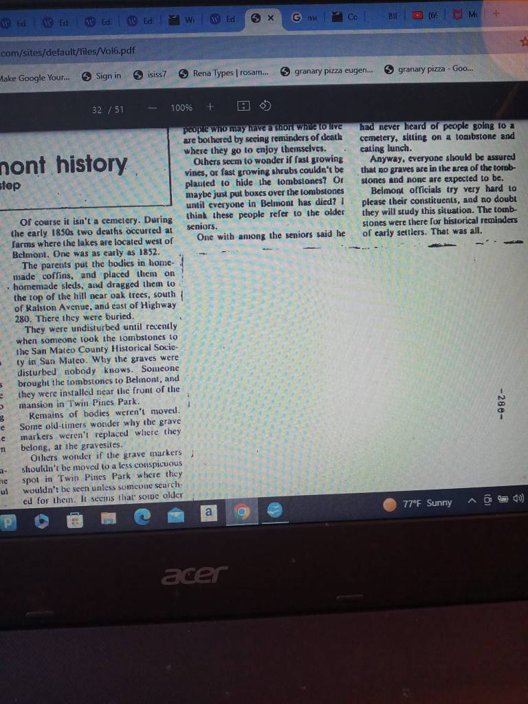 Around 11;12 A.M. on July 29, 2024, I had a revelation. Five days ago I read an article by Russell Estep who was a member of the Belmont Historic Society. He writes about the musical graves game being played with graves.in Belmont near Ralston Hall. I wondered why, and who wrote about the graves dug, and the tombstones placed near William Ralston’s home in 1852. Why did they remain there for so long, then – they’re out of there! Cark Janke and Family arrived in 1849. I believe they are members of the Arguello family who may have designated a family plot in a Deed when they transferred property – they never lived on? Is this correct? There are laws about this. Were the graves of Carl Janke and his wife, Dorothea put in the Arguello graveyard? Did they get permission – in wiring?