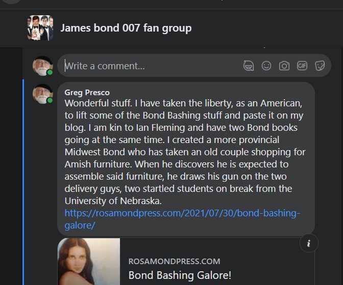 I’ve been a member of this group now a few months and have to say after tonight I’m disappointed in alot of its members.Being a Bond group you’d think the majority of members would be a bit more mature to others in the group especially when someone posts its got to the point their leaving. Some of the comments left on the group members post were utter childish and showed no respect for a fellow fan. Is that really the kind of group this is? Maybe next time instead of leaving a nasty comment, stop and think and perhaps scroll on. Its a more mature thing to do.