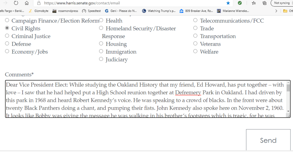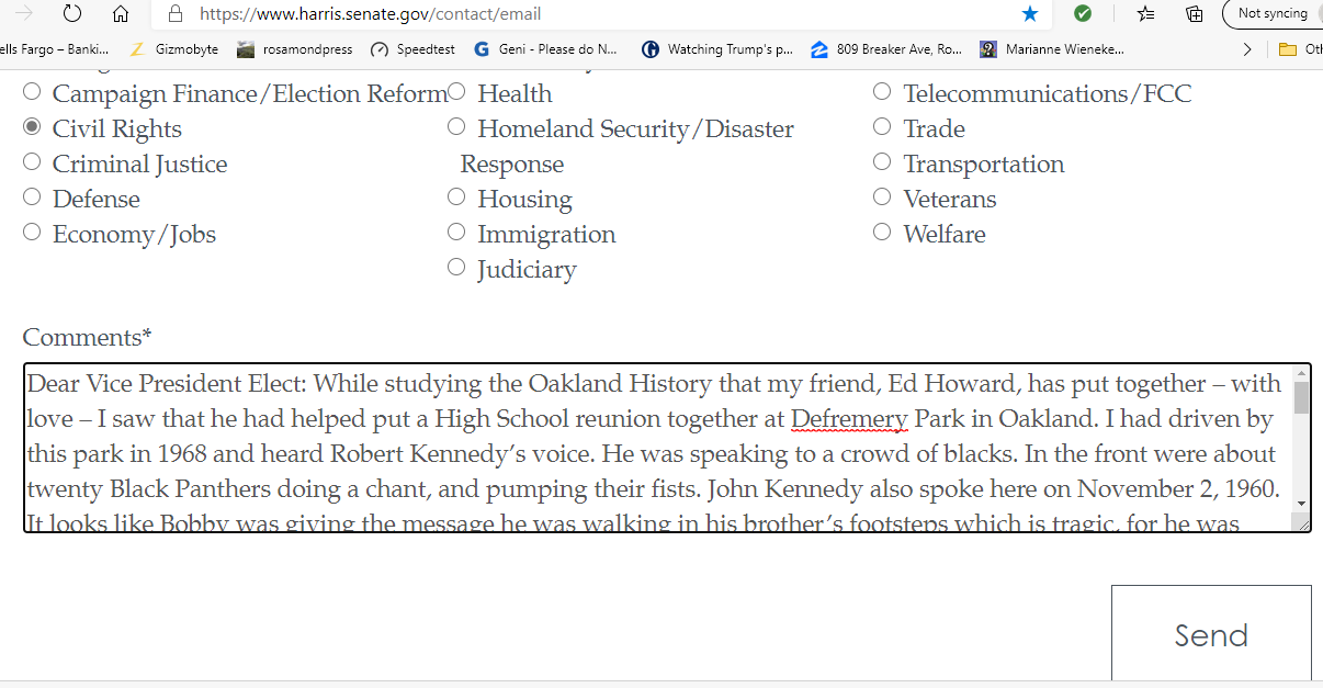 Dear Vice President Elect: While studying the Oakland History that my friend, Ed Howard, has put together – with love – I saw that he had helped put a High School reunion together at Defremery Park in Oakland. I had driven by this park in 1968 and heard Robert Kennedy’s voice. He was speaking to a crowd of blacks. In the front were about twenty Black Panthers doing a chant, and pumping their fists. John Kennedy also spoke here on November 2, 1960. It looks like Bobby was giving the message he was walking in his brother’s footsteps which is tragic, for he was gunned down four days after he spoke to the people of Oakland where you were born. The man this park was named after married a mulatto woman. When you read John’s speech, it is the same message many Democrats are giving – this very day! We need to launch a real progressive movement here, not one that has been watered down. I know Ed Howard and I would like to see our history not go round in circles. We are in our seventies. We would like to see you come home and launch your Vice Presidency at Defremery Park that should be declared a National Park and Monument. Ed and I would like to be on the committee. We are Oakland natives with a mountain of ideas and enthusiasm.