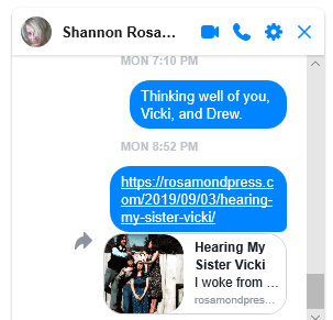 “I woke from my nap with a start. I was communicating with my surviving sister, Vicki Presco, in a way only sibling can. We own psychic-souls that are forever trying to send the very best messages, because, we share the same fate, the same birthing channel that brings us here, and, takes us away. I love my sister, my daughter, my grandson, and my nieces. Why not my nephews. This is so very hard because Vicki is trapped in her condition. She can not just pick up the phone to say hello. She is saying hello – as I type!