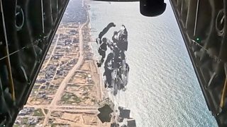 0:55Watch: US cargo plane airdrops humanitarian aid into Gaza