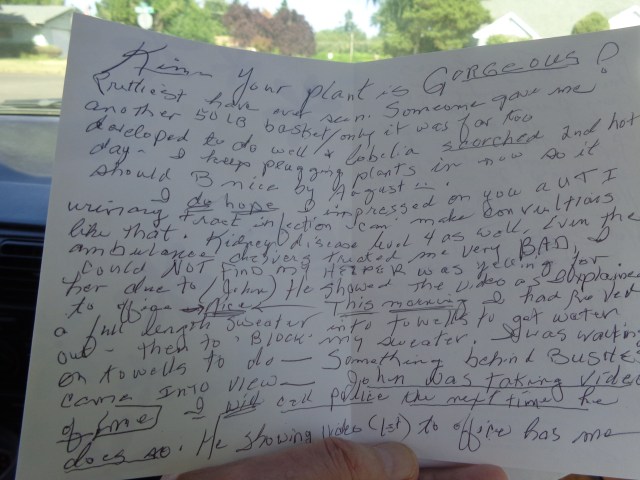 In the letter she gave Kim she says she freaked out when she could not find her helper. She says she had a “urinary tract infection”. I heard loud banging. I had Kim call her. She did not pick up, or, call 911 herself. When I heard clawing at my door, and opened it, she tumbled in. Taking off her glasses, she tossed then inside. She made sure I could not close my door. If I – a male did this – to her? They had to strap my neighbor onto a gurney. This was a very unpleasant experience for me. In her mind, I had no empathy.