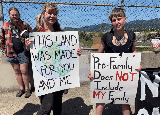 Love Chicken is now going to be about Donald Trump, too. Many claim he is mentally ill. He empowers himself with the mentally ill by claiming he is a Christian – and on their side. I believe half, if not all, the folks on the Harlow Road overpass, suffer from mental illness, that is being masked by Religious Addiction, and reaction to our National Disease. The folks wearing the “Hex” and the upside down cross, probably have evangelical parents.
