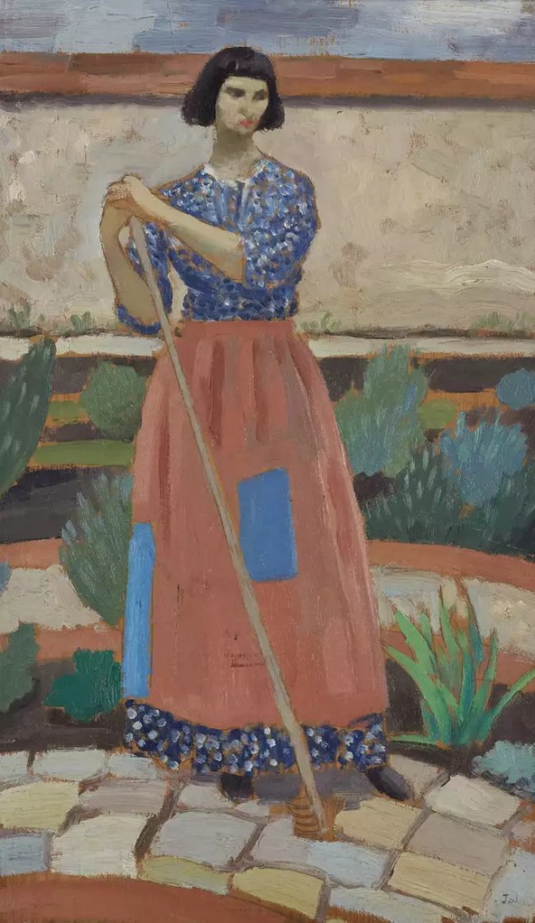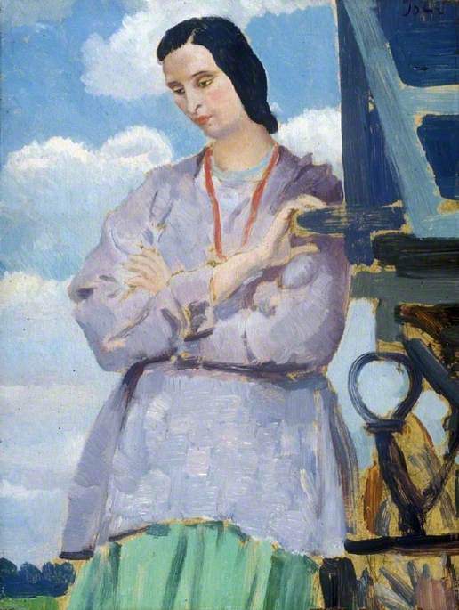 John began making quotidian figure studies of Dorelia often in domestic settings around 1910, and they were highly successful commercially, perhaps reflecting the public’s idealised desire for a more simple existence. This work demonstrates her easy confidence and charm, dressed in her homemade clothes that reflected the pairs’ interest in Romani culture. Similar works in public collections are Washing Day, circa 1915 (Tate) and ‘Dorelia in the Garden at Alderney Manor, Dorset’ (Yale Center for British Art).
