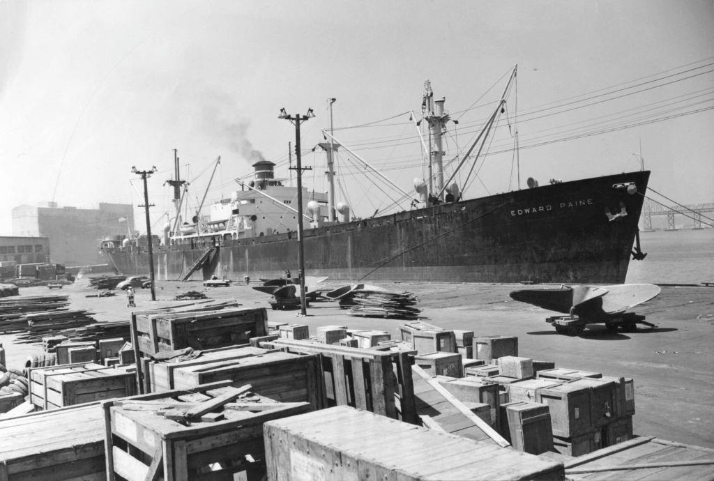 Oakland, CA circa September 1947 – Incoming and outgoing freight is piled high on the wharf of the Port of Oakland Outer Harbor. (Leo Cohen / Oakland Tribune Staff Archives)