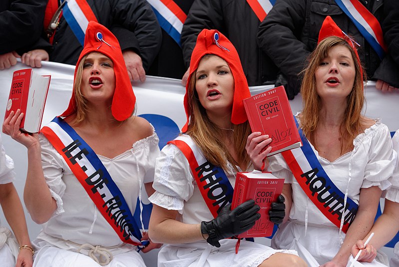 Marianne is a significant republican symbol; her French monarchist equivalent is often Joan of Arc. As a national icon Marianne represents opposition to monarchy and the championship of freedom and democracy against all forms of oppression. Other national symbols of Republican France include the tricolor flag, the national motto Liberté, Égalité, Fraternité, the national anthem “La Marseillaise“, the coat of arms, and the official Great Seal of France. Marianne also wore a Cockade and a red Phrygian cap symbolising Liberty.