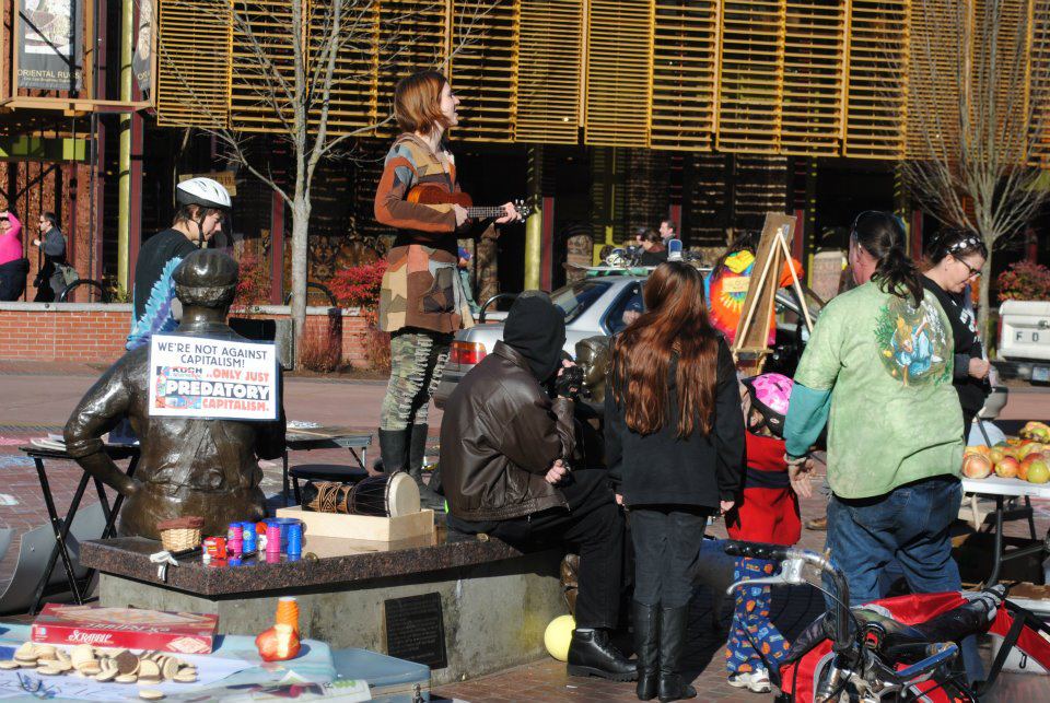That’s Alley standing up playing an instrument. She is putting on a Art Happening made up of the homeless. Of course passerby’s give them money for a creative cause. Babbs wanted hanger-ons to buy his book. Vance and Trump keep saying they are doing evil for the sake of SOME AMERICANS. This evil has caused many European Nations to ISSUE A TRAVEL ALERT! It wasn’t safe to go to Downtown Eugene. The Republicans are ending all giveaway programs, including giving aid to our old allies, that are not our allies anymore! Alley has been living in France for five years.