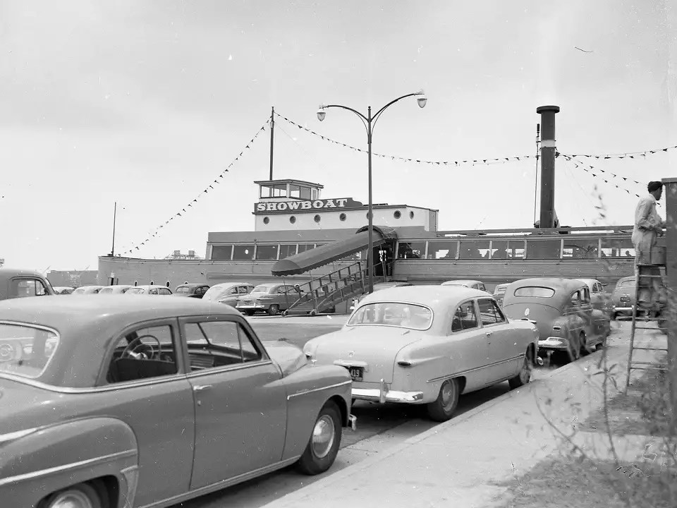 In 1951 the Petaluma, a paddlewheel steamboat, dropped anchor at the foot of Broadway at Jack London Square. Renamed the Showboat Restaurant, and renovated to house a circular bar on the upper level and a spacious dining room below, it was described as a floating palace. There was a ladder and a mooring to allow local yachtsmen to drop off their passengers on the boat for a meal or a drink.