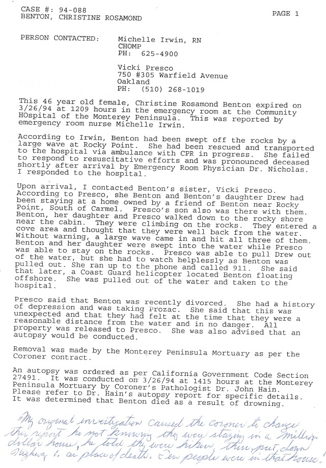 drowned, I heard from her friend that lives in Pacific Grove, that