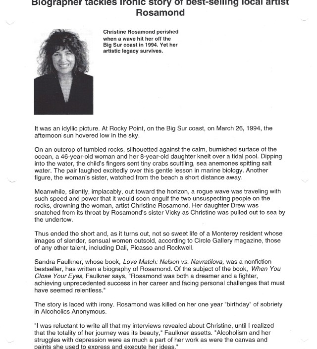 “Along the precipitous coastline, the Pacific is elusive in its moods. That was foremost in Donald Lane’s mind in voicing his warning. When near the water’s edge, visitors must follow a fundamental rule: Never turn your back on the ocean. Yet on this fine spring morning, that is precisely what Christine Rosamond does. She sits on a rock with her back to the sea and jams her hands securely in the leather jacket’s pockets.”You know,” she says aloud, “if a giant wave came right now, it could take out to sea and I could drown.”