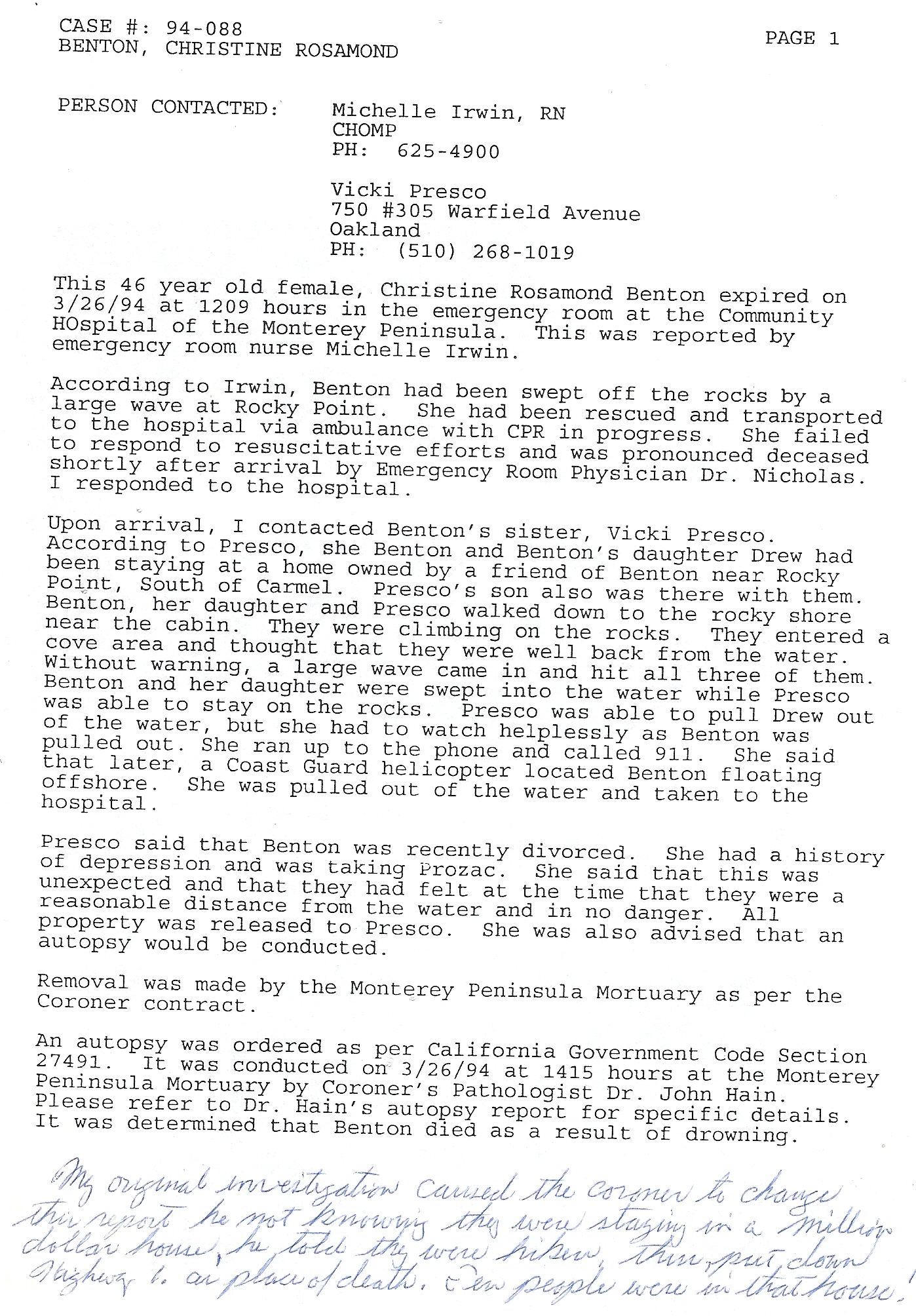 Everyone gets to know how their loved one dies, especially if it was a tragic accident. My mother told me Christine Rosamond Benton – killed herself out at Rocky Point.