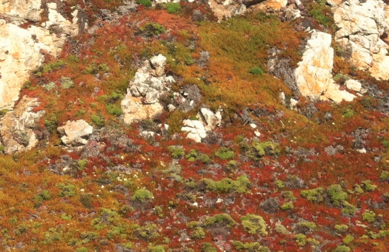 Here is part of the house my kindred stayed in. When I walked down to the “bowl” carved out by large cascading waves, the going was difficult due to many rocks and boulders under the ice-plant. You can see some of them, the larger ones, where perhaps a lizard might perch?