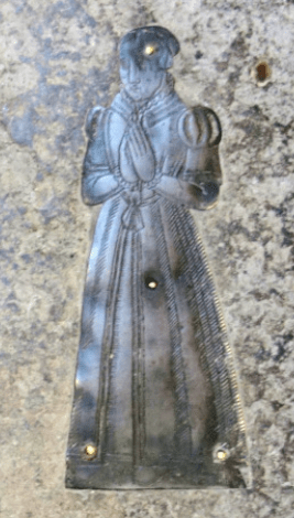 On the North Side lied a Grave-stone, on which, in Brass Plates, is the Figure of a Man, and this Inscription.