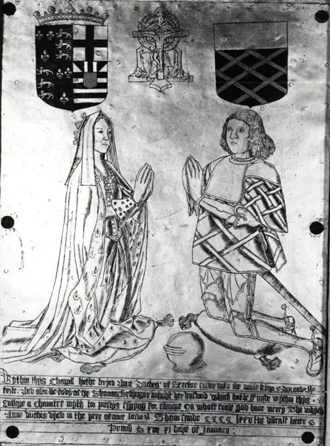 “William Wilson was educated at Merton College, Oxford, was prebendary of St. Paul’s and Rochester Cathedral, Rector of Cliffe, Kent, and in 1584 became Canon of Windsor. He and his wife Anne’s wills are printed in Henry F. Waters, Genealogical Gleanings in England (Boston, 1901), 1:54, 55, 1397. Elias Ashmole in History and Antiquities of Berkshire (Reading, 1736) recorded monumental inscriptions to them once located in St. George’s Chapel but now lost. The shielf of arms to him and his wife, however, is still extant. the illustration below is from a rubbing [photo on file] ”