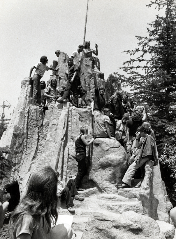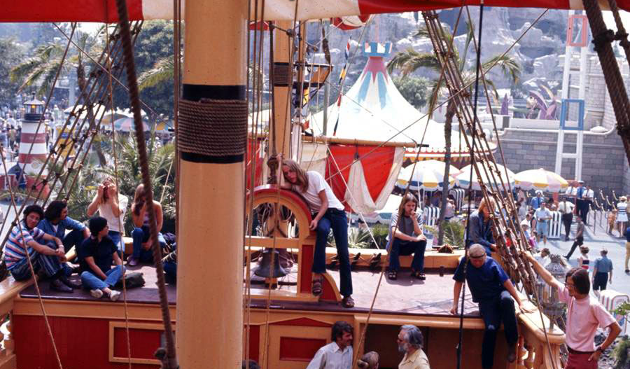 As they made their way into the park, the Yippies were involved in argumentative altercations with regular guests, which Disney cast members and security handled themselves without calling in the police who were on standby behind the shops on Main Street. For the most part the Yippies were initially harmless – smoking marijuana on attractions, climbing the mast of the Chicken of the Sea pirate ship, and scaring the more conservative regular guests with their generally non-conservative behavior and appearance. As the day wore on, however, the Yippies made their way to Tom Sawyer Island, where they “captured“ Castle Rock, raising a Viet Cong flag while getting stoned .
