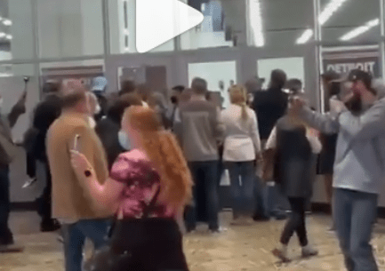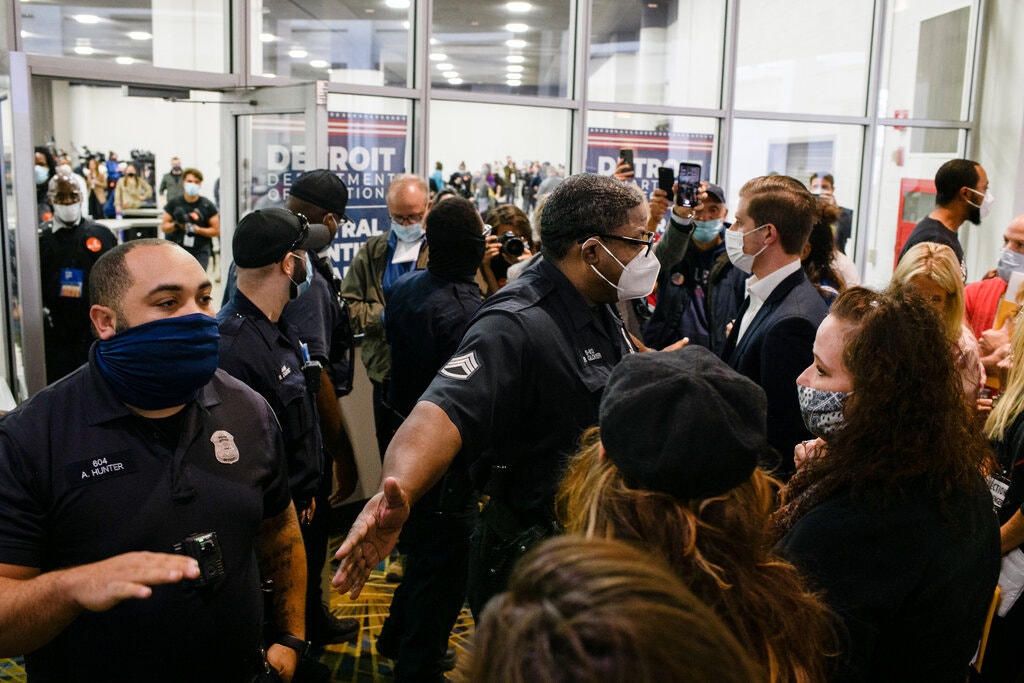 A small crowd of would-be challengers chanted “stop the vote” and “stop the count” just off Jefferson Avenue at an entrance to TCF Center, with some shouting occasionally that they should be let in to observe the count. Another group swarmed around the entrance to the absentee counting center inside TCF Center, chanting loudly and at some points banging on windows that looked into the room where hundreds of election workers were counting ballots.
