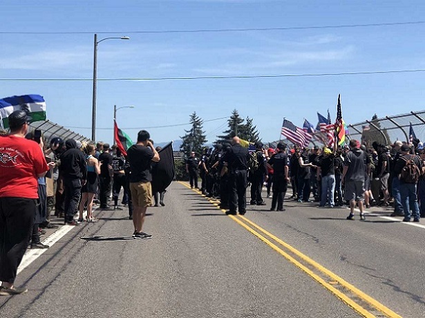 The so-called “God, Guns and Liberty” rally (formerly “God, Guns and Trump”) drew approximately 50 to 60 right-wing supporters while also bringing out around 250 to 300 counter-protesters and many more spectators from Saturday Market. Many rally-goers came armed, with some carrying AR-15 style assault rifles and wearing tactical gear.