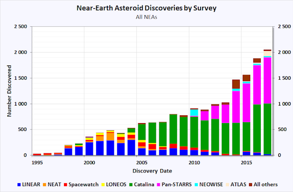 Using this approach to survey large swathes of sky, astronomers have discovered thousands of near-Earth asteroids, including more than 2,000 during 2017 alone.