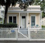 Two very old houses that have maintained their original appearance can be seen side-by-side at 220 and 214 Dolores Street. The “Tanforan Cottages,” so called because members of the family of Toribio Tanforan occupied them from 1896 to 1945, are simple frame structures with modified late Classical Revival facades. Though very nearly identical in appearance, they were not constructed at the same time; 214 Dolores is said to have been built a little before 1853, 220 not long after that date. This dating is questionable, though, as the first substantiated date is 1866, when Revilo Wells, owner of 214, had water piped in. There is still a small carriage house behind 220 Dolores – occupied as late as 1940 by one of the Tanforan carriages. The large gardens of these houses have been well-maintained and contain many specimens of turn-of-the-century San Francisco taste in flora.