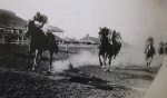 Thoroghbred horses racing at Emeryville cross the finish line in front of grandstand circa 1910. Oakland Trotting Park opened in 1871, and for 25 years featured harness racing. The track rebuilt in 1896 and renamed the New California Jockey Club. It closed in 1911. Photo, c 1910. (Courtesy , The Bancroft Library)