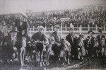 The Emeryville dog race track, known as the Blue Star Amusment Park, was built by Owne Patrick Smith in 1920. The track was located on Park Avenue between Horton and Holden Streets. In this sport, greyhounds chased a mechnanical rabbit around a quarter-mile track, and fans bet on the winner. Photo, 1920. (Courtesy, Oaks Club, The Emeryville Historical Society, The Bancroft Library)