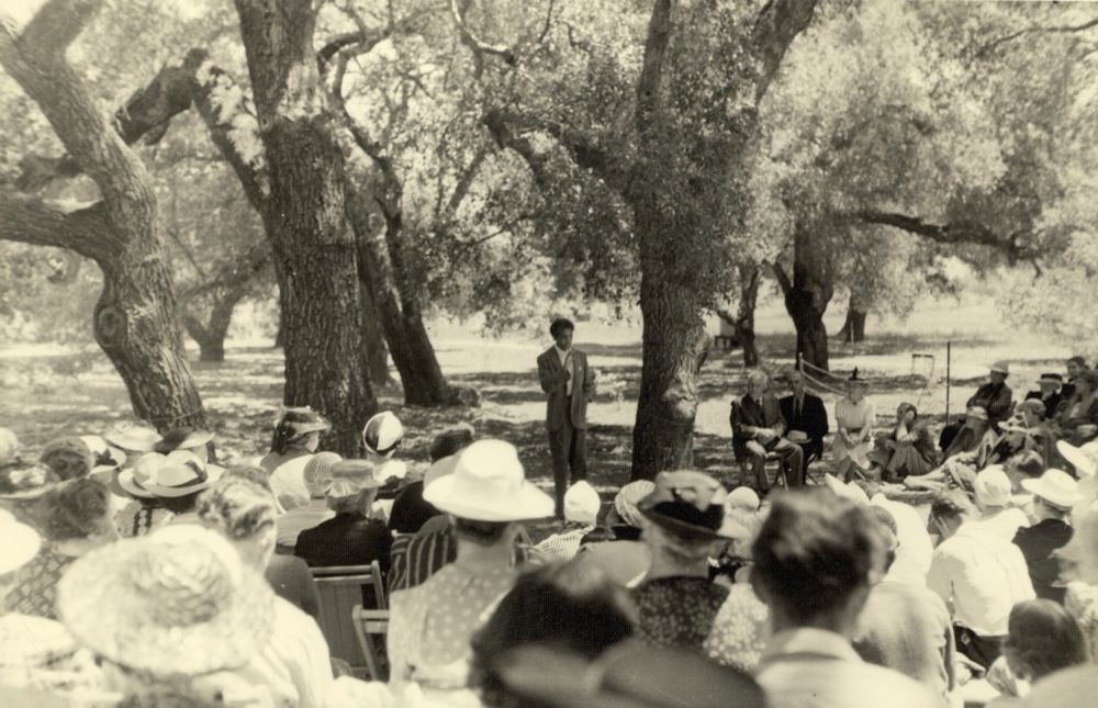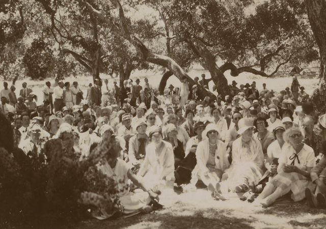 Away from the hum of the trolley, your climbing automobile will suddenly at a twist in the road, land you in a wonderful garden, facing a picturesque Moorish house which might have been transported from ancient India. Inside the house, instead of the turbaned, white-robed dreamers of India, whom you feel you have every right to expect, you come upon a group of gentle mannered women, all clad in very long dresses. [Outside] you won’t see nor hear any movement … except the birds in the trees, the humming insects in the lazy sunshine, and the daring goldfish in the splashy fountains, while the roses nod to you, and the little Moorish summer houses with their enveloping vines will make you sure you’ve discovered a bit of dreamland.