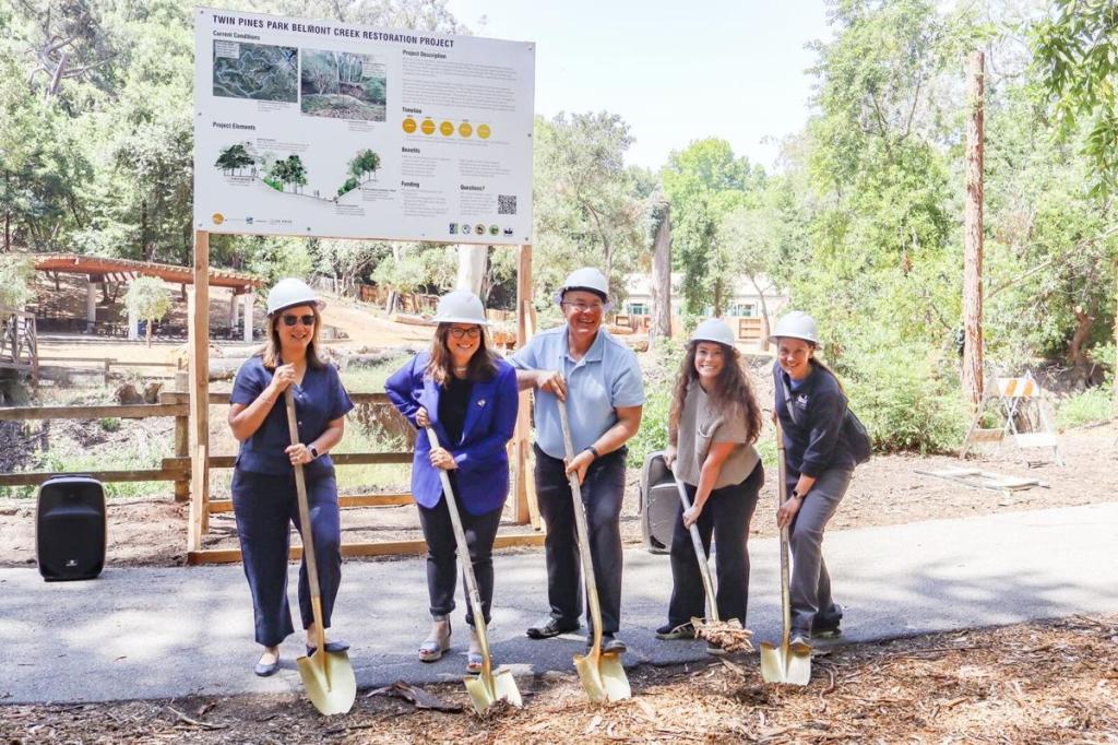 Belmont Vice Mayor Robin Pang-Maganaris, Mayor Julia Mates, Parks and Recreation commissioners Avery Lyford, Arianna Cunha and Adar Emken break ground Tuesday, June 3, of the Twin Pines Park Belmont Creek Restoration Project to restore the health and resilience of Belmont Creek by reducing erosion, improve flood protection, enhance public access and support native wildlife habitat.