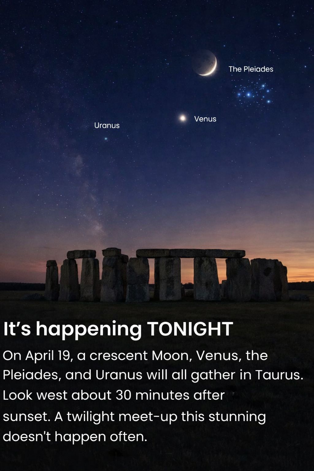 On April 19, step outside and look toward the western horizon about 30 minutes after sunset. A beautiful celestial lineup will be visible in the evening sky.