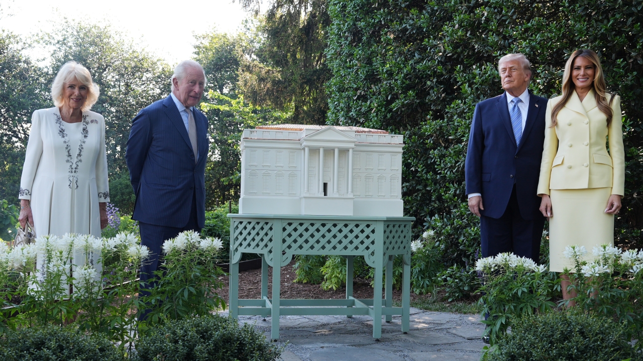 President Donald Trump and first lady Melania Trump along with Britain’s King Charles III and Queen Camilla look at the garden and bee hive on the South Lawn of the White House, Monday, April 27, 2026, in Washington.